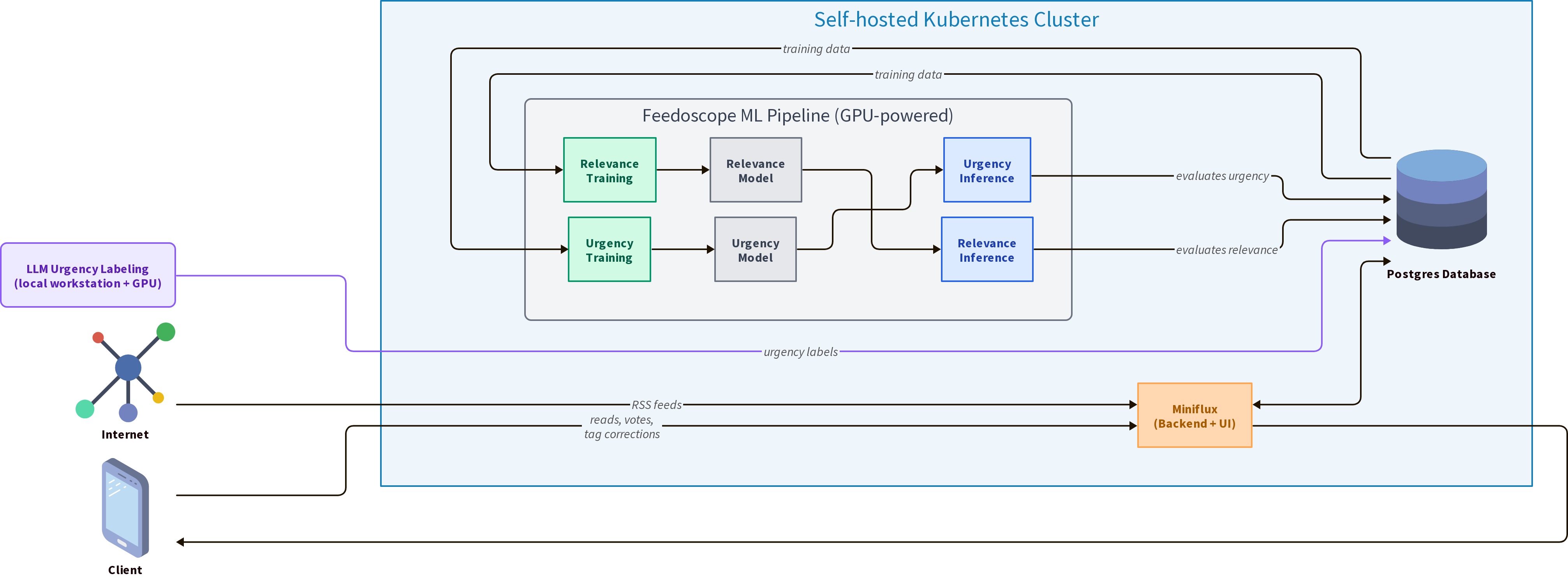 I’m happy with how this turned out. The migration to Miniflux simplified a lot of things, and the tagging system turned out to be a perfect fit for the urgency correction workflow. The distillation approach gives me the best of both worlds: the reasoning ability of a large decoder model for labeling, and the speed of a small encoder model for production inference.